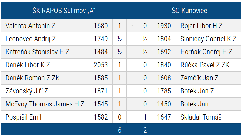 Dnes jsme v Sulimově přivítali hosty z Kunovic k 1. kolu ZKS. Jelikož nás na Kuturním domě zradil plynový kotel, museli jsme utkání odehrát v zasedačce OÚ. Myslím, že prostory byly příjemně vytopené a samotná šachová hra touto změnou nijak neutrpěla. Zápas se od začátku vyvíjel pro nás velmi pozitivně. Jako první ukončil svou partii Thomas, který získal pěšce a soupeře postavil do pozice, kdy získával další materiál a vedli jsme 1:0! Na třetí desce Staňa zremizoval svou partii ve zřejmě vyrovnané pozici. Jako další zvítězil Roman, který svého protihráče postavil do problémů s obranou své rošády a tomu po dlouhém přemýšlení vypršel čas - 2,5:0,5. Emil na poslední šachovnici neubránil volného pěšce a musel rezignovat - 2,5:1,5. Na nejvyšším postě hrající Tonda sice prohrával o pěšce, ale soupeř udělal hrubou chybu a před matem se vzdal - 3,5:1,5. Na druhé šachovnici Andrij vedl o pěšce, ale v těžké věžové koncovce se nakonec soupeři dohodli na remíze - 4:2. Jirka hezkou kombinací získal jezdce a ve hře dvou věží a jezdce proti dámě jasně zvítězil - 5:2. No a nakonec jsem dohrával já. Asi v remízové pozici jsem již dříve nabídl plichtu, ale soupeř za nepříznivého stavu pro hosty odmítl. Začal partii, jak se říká, lámat přes koleno a to se mu stalo osudným. Jeho nabídku remízy jsem odmítl a partii dotáhl do vítězného konce - 6:2. Všem děkuji za skvělé první kolo a budu se těšit za tři týdny na zápas v Bojkovicích.