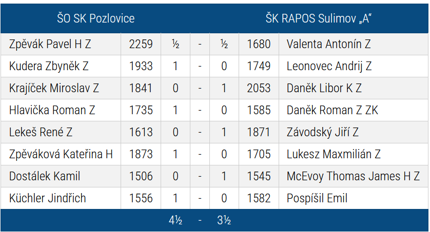 17. ledna se hrála v Hovězí nedaleko Vsetína 4 kola Krajského přeboru družstev starších žáků. Závěrečná 3 kola se budou hrát 11. dubna v Boršicích. Hned úvodem chci říci, že naši šachoví reprezentanti byli mimořádně úspěšní, předvedli opravdu parádní výkon. Sestava našeho družstva byla následující: 1. šachovnice Adam Tučapec, 2. šachovnice Alexandr Bradáč, 3. šachovnice Alex Kalenda 4. šachovnice Petr Novotný, 5. šachovnice Joshua Šumbera a Míša Kurinnyi, 6. šachovnice Viki Válková. V 1. kole jsme hráli s absolutním favoritem turnaje, družstvem Starého Města a prohráli jsme 0,5 : 5,5. Je třeba zdůraznit, že i ostatní družstva prohrála s tímto družstvem a to většinou 0 : 6! Pak už to byla parádní jízda, ve 2. kole jsme porazili družstvo ŠK Zlín 5 : 1, žádný náš hráč neprohrál a bod jsme ztratili pouze dvěma remízami. Jen pro zajímavost, Viki Válková měl v partii o 3 figury navíc, ale partie skončila bohužel patem. Bylo nádherné, když družstvo malé obce Sulimov porazí reprezentanty našeho krajského města družstvo Zlína. Ve 3. kole jsme porazili družstvo Šachy Hošťálková 4,5 : 1,5 a ve 4. kole jsme deklasovali tým ŠK Vsetín "B" 5,5 : 0,5. Jen pro zajímavost ve druhém až čtvrtém kole jsme z celkového počtu 18 partií prohráli jen jednu partii! Po 4. kole přeboru jsme na vynikajícím 4. místě a máme stejně bodů jako 2. a 3. tým soutěže. Já osobně jsem vůbec nečekal takový výsledek a musím opravdu všechny chlapce a Viktorku pochválit. Děkuji všem za vzornou a především úspěšnou reprezentaci. Panu Kalendovi, panu Válkovi a panu Šumberovi děkuji za dopravu šachistů na turnaj, moc nám pomáháte a určitě se také těšíte z výsledku našich šachistů. Podrobné výsledky z Krajského přeboru družstev můžete vidět na odkaze dole. Těším se, že se v podobné sestavě uvidíme také na zbývajících 3 kolech přeboru v Boršicích, mějte se pěkně, Jan Štefek.